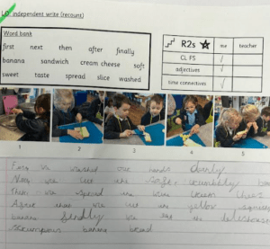 This week, the children wrote their own independent recounts of making their banana sandwiches and they were fantastic. Using what they have learned this half‑term, they included expanded noun phrases (adjective, adjective noun) and time connectives, remembering to use a comma after each one.