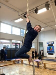 Year 2 had an exciting Gymnastics lesson this week as they explored all the large equipment in the hall. The children practised climbing the ropes and climbing frame, developing their strength and control. They carefully balanced along the beam and moved across the apparatus in different ways, stretching, jumping, twisting and travelling with confidence.