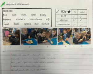 This week, the children wrote their own independent recounts of making their banana sandwiches and they were fantastic. Using what they have learned this half‑term, they included expanded noun phrases (adjective, adjective noun) and time connectives, remembering to use a comma after each one.