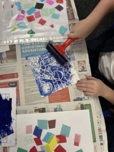 The children carefully pressed their plates onto paper to reveal their prints and were very proud of the results. They showed great creativity, focus and perseverance, and the final artwork looks fantastic.