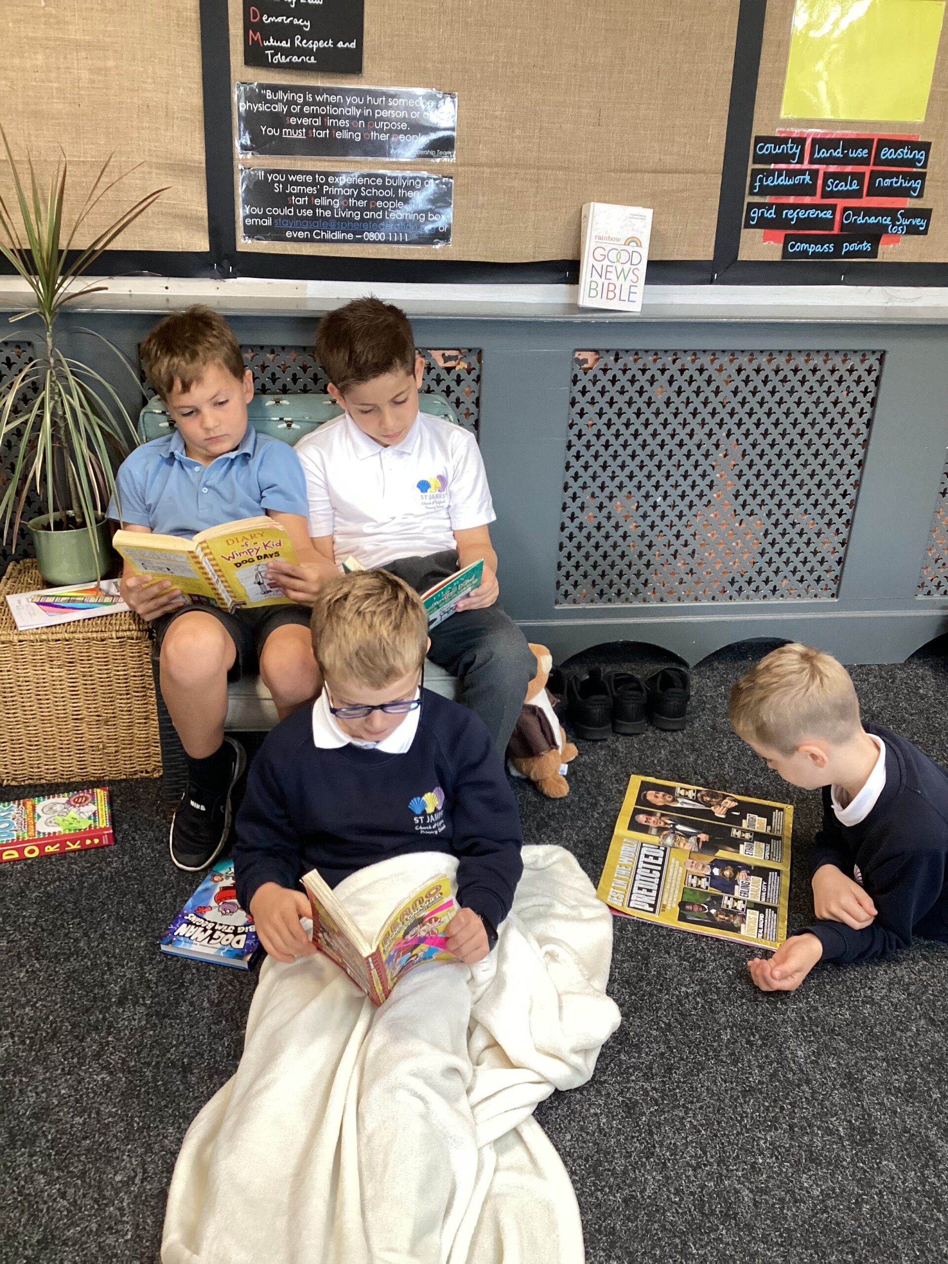 We shared some of the challenges we’ve completed this week in our Reading Records and reminded ourselves of all the different activities we can choose from. After that, we enjoyed some independent reading in various spaces in the classroom.