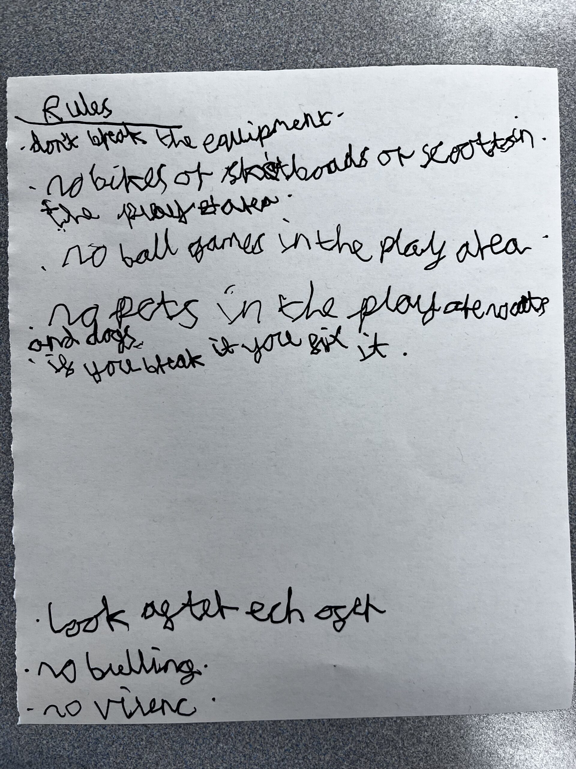 We’re going to send our suggested rules to Wetherby Town Council and see if they would like some hand made posters to encourage users to make the park a happy and healthy place to play!