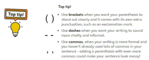 Parenthesis is the use of a phrase, word or sentence that’s added into writing as extra information or an afterthought. It’s punctuated by brackets, commas or dashes.