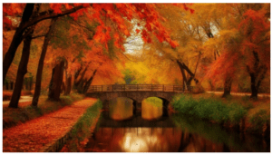 At the brink of noon, leaves fluttered down from the trees. The smooth stream flowed like a snake whilst the trees gently arched over. Leaves lay on the ground like a blanket. The scenery was a beautiful fusion of orange and yellow leaves. Nervous leaves coated the undergrowth in a crispy texture giving it a snug and tranquil feeling.