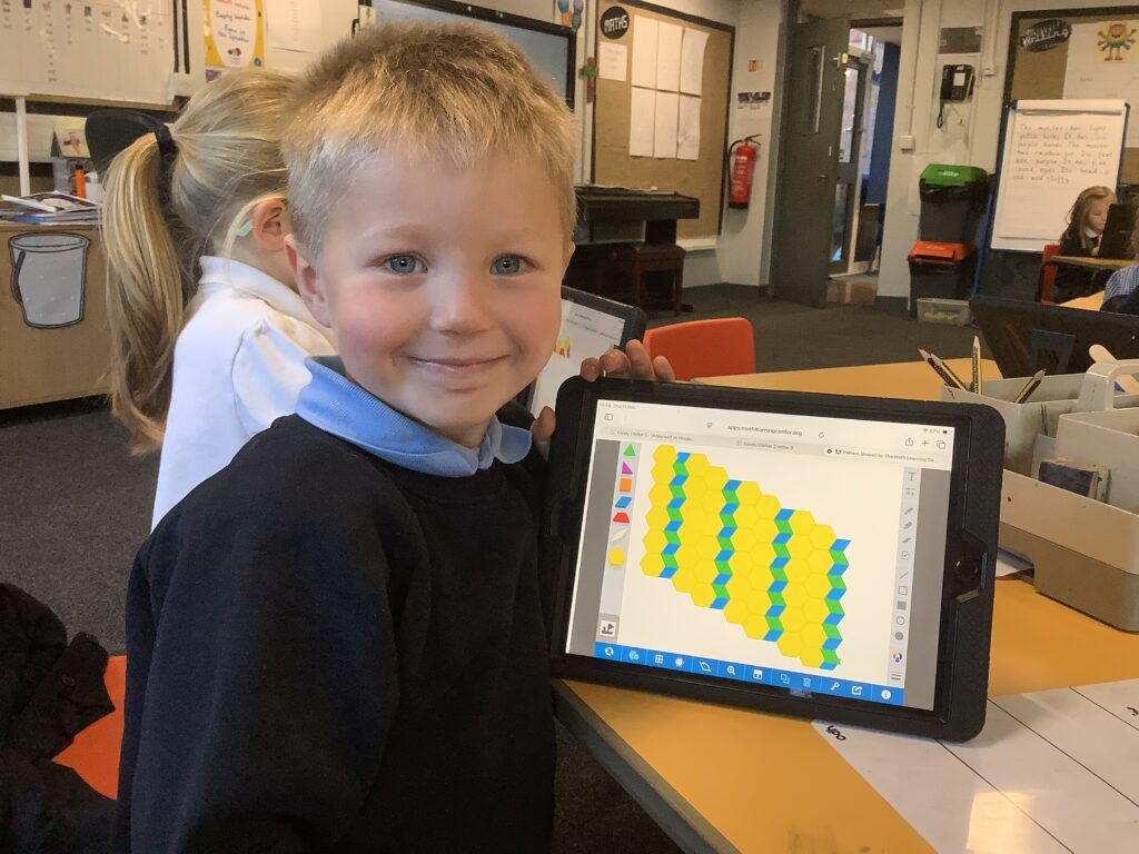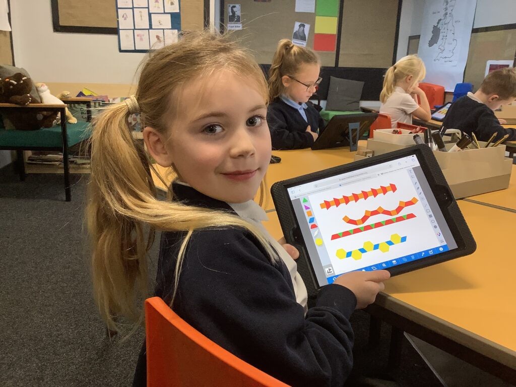This week, in maths, we’ve been learning about 2D shapes and patterns. Our focus has been on aligning shapes with one another by rotating them to connect their edges.